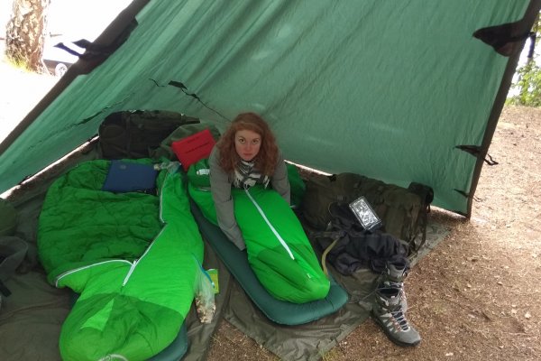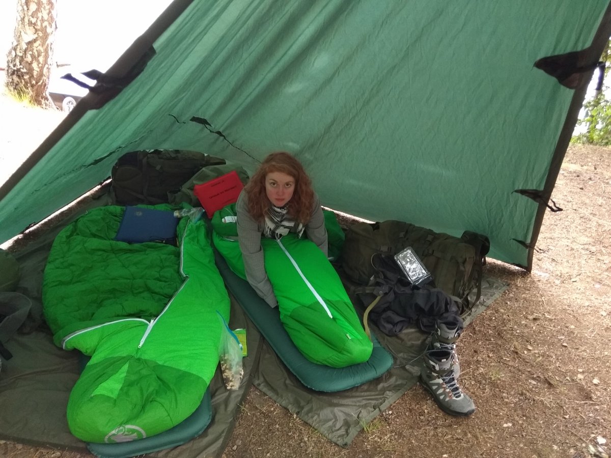 Nach dem Lagerbau erkundeten wir auf der Suche nach zwei für Stockbrot geeigneten Stöckchen die Umgebung. Anschließend kümmerte Natalie sich wieder um unser Mittagessen und ich reparierte meine Iso-Matte: