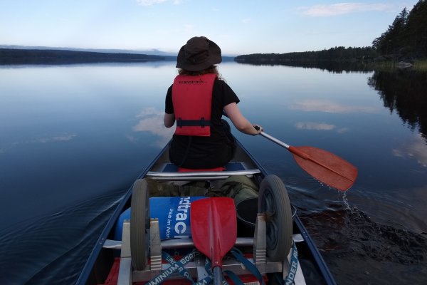Keine Motorboote oder andere Kanuten störten die Ruhe, nur wir durchschnitten mit unserem Kanu die spiegelglatte Oberfläche des Sees.