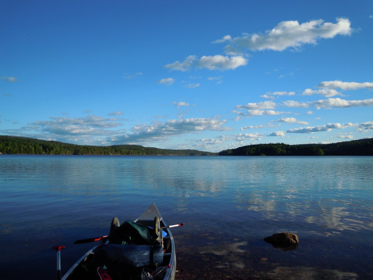 Heute ging es erst spät los, über einen verschlungenen Fluss kamen wir ziemlich weit ins Landesinnere und mussten dann nur noch ein kurzes Stück bis zum See Veder Blomsjön umtragen. Da der Himmel wieder ohne Wolken war, haben wir ein erfrischendes Bad genossen und uns danach zur Stärkung eine Frühlingssuppe gekocht.