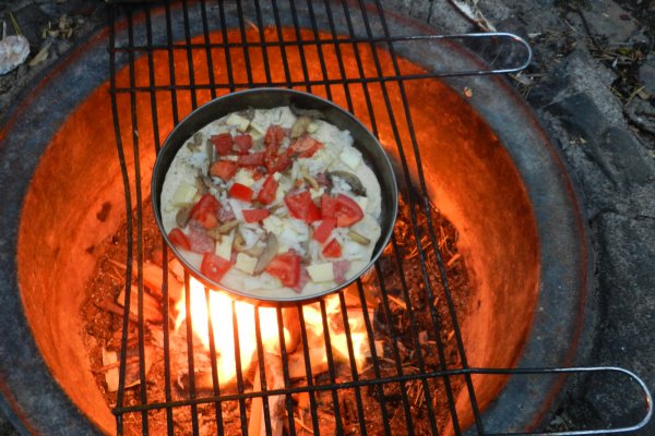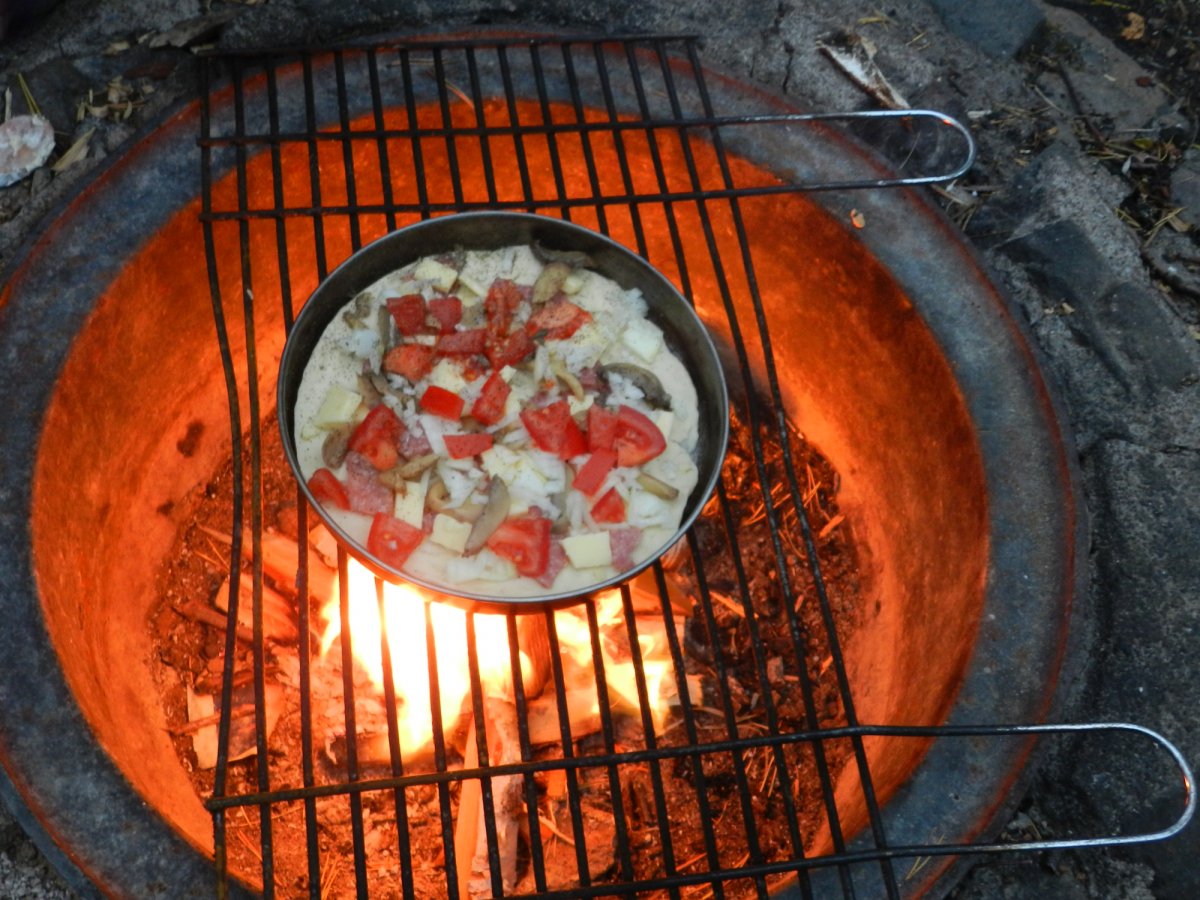 Der Platz war herrlich und wir hackten Holz, machten Feuer und begannen die leckere Outdoorpizza zu backen. Die erste Pizza war fertig. Leider konnte die zweite nicht vollendet werden, weil es mal wieder schlagartig zu schütten begann. Hier wäre ein Regenschirm hilfreich gewesen, den wir natürlich nicht dabei hatten. Ab diesem Zeitpunkt verbrachten wir die meiste Zeit inklusive nächsten Tag im Zelt. Die selbst mitgebrachten Gummibärchen und die Prinzenrolle neigten sich leider auch dem Ende zu, was unsere Stimmung nicht unbedingt hob.
