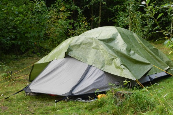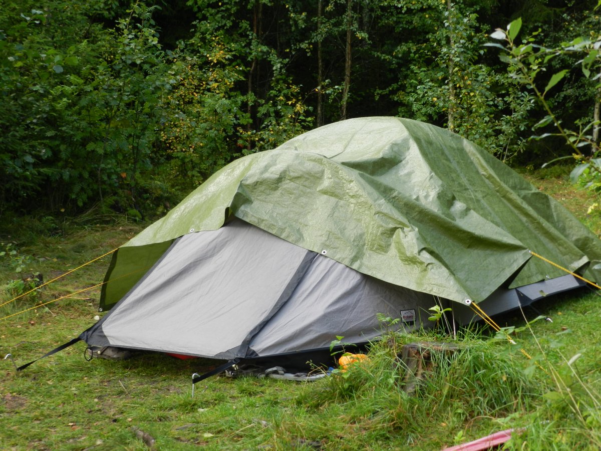 An Tag 13 hatten wir noch kürzere Abschnitte ohne Regen bevor es wieder sintflutartig zu regnen begann. Und irgendwann kamen vereinzelt Tropfen durch das Außenzelt auf das Innenzelt, was uns ziemlich beunruhigte. Zum Glück hatten wir die große Plane in unserer Ausrüstung, die wir kurzerhand über das Zelt spannten und an den Spannschnüren befestigten.
