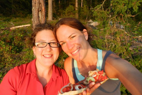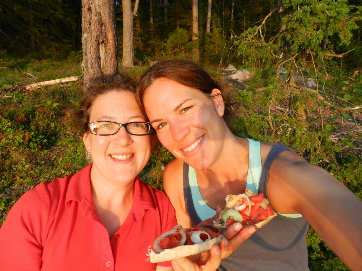 Wir hatten drei Packungen Mehl an Bord, die wir auch in den zwei Wochen restlos aufbrauchten. Unser Lieblingsessen war Pfannkuchen mit Nutella und Beeren. Desweiteren fertigten wir daraus Maultaschen mit verschiedenen Füllungen, Stockbrot, Pizza und Zupfnudeln. Es machte sehr Spaß solche Rezepte aus dem Outdoor-Buch auszuprobieren. Manche Gerichte gelangen richtig gut, wohingegen unsere Blaubeer-Pancakes leider eine Pleite waren. Weil wir so viele Blaubeeren gepflückt hatten, war das Blaubeeren/Teig-Verhältnis zu hoch und ergab eine blaue Pampe. Wir versuchten diese mit Nutella zu retten, was nicht sehr ansehnlich aussah, aber trotzdem noch einigermaßen schmeckte, obwohl es sehr üppig war.