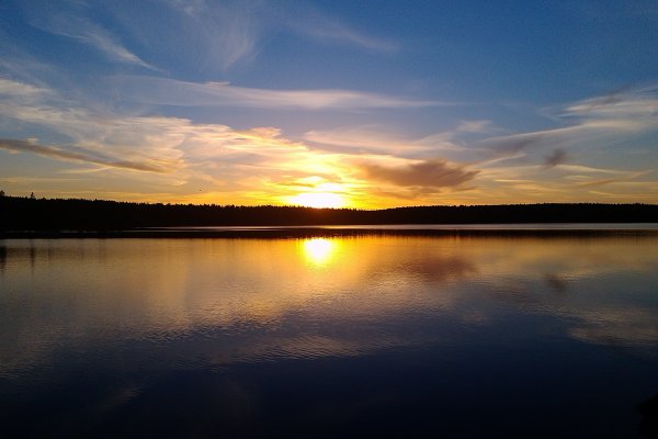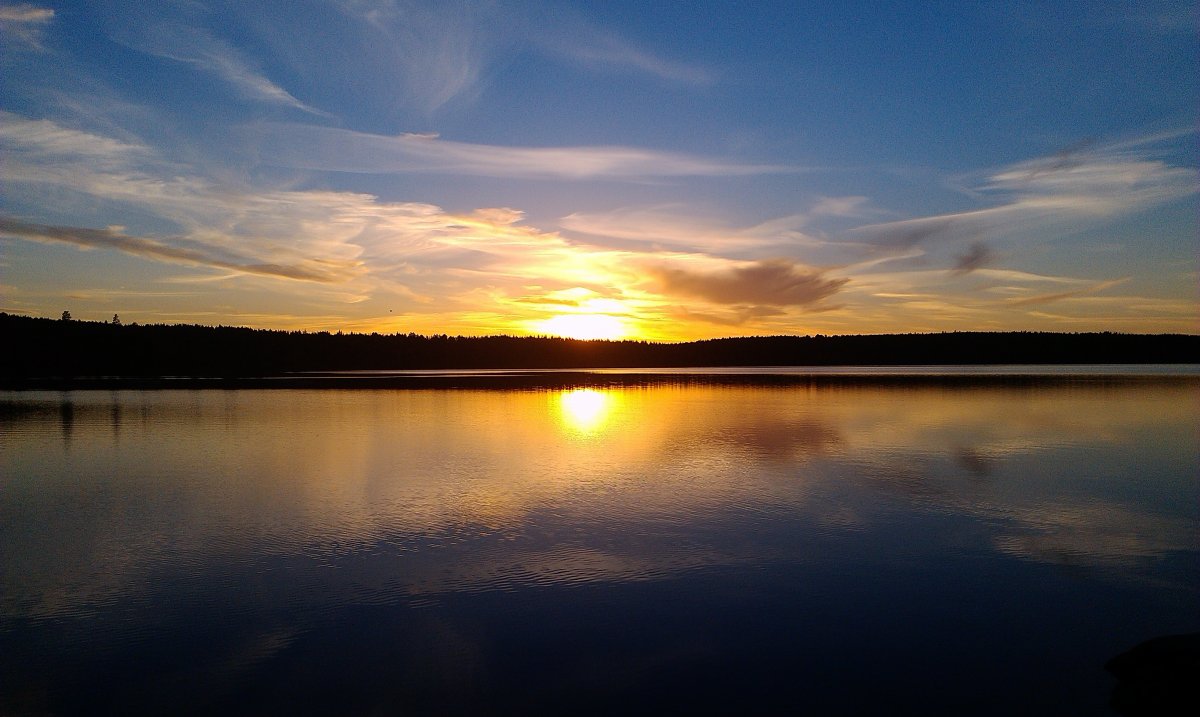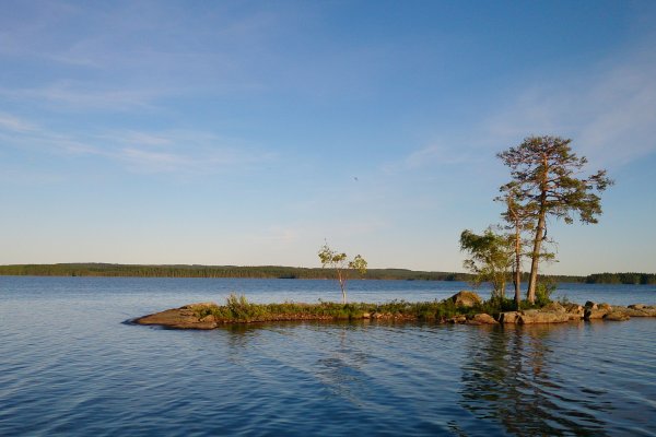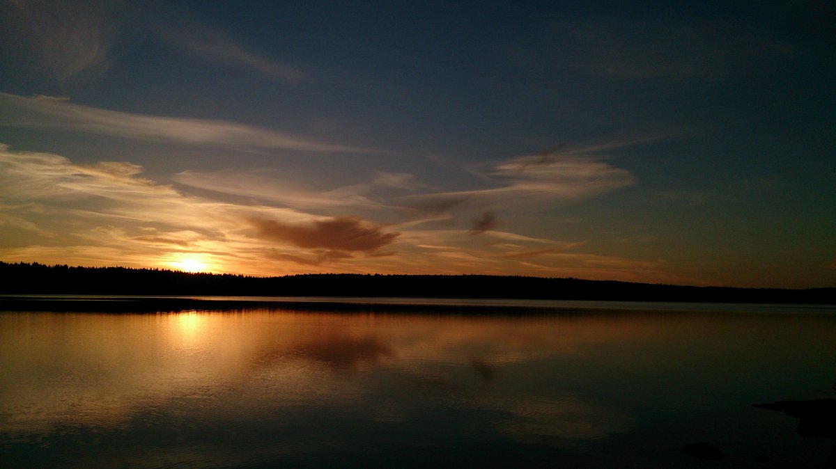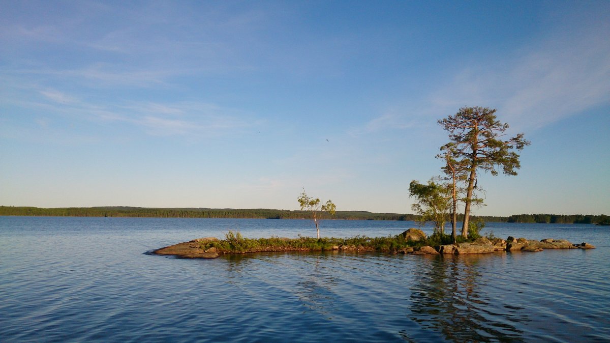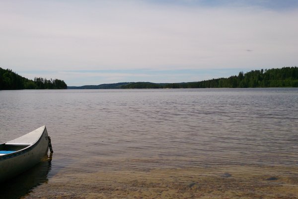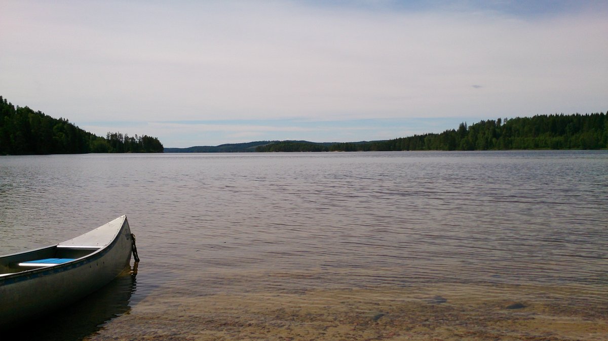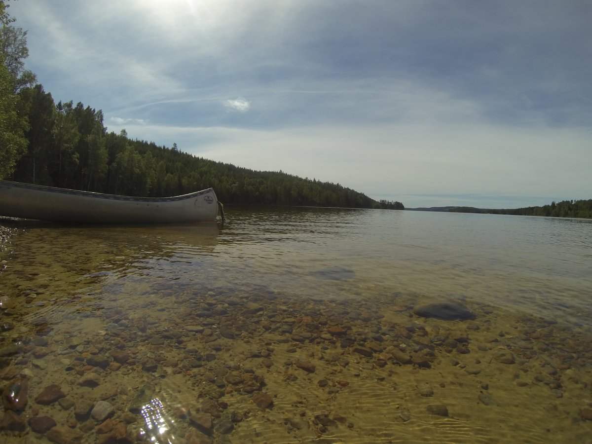 Am nächsten Tag wurden wir recht früh wach, frühstückten erst, und fuhren dann mit dem Kanu kurz zum Camp – mein Mann wollte sich noch einen Angelschein besorgen, der Shop, in dem man ihn erwerben kann, hat nur einmal kurz am Tag auf, und die Zeit hatten wir am ersten Tag knapp verpasst. Danach schauten wir uns noch den südlicheren Teil des Sees an. Das Wasser war ziemlich ruhig, kaum Wind, die Sonne schien, und die Paddelbewegungen haben wir auch allmählich wieder drauf. Da störte auch der Muskelkater vom Vortag kaum. So ließ es sich echt aushalten. Später haben wir dann gekocht, gebadet (Mitte Juni ist der See noch richtig kalt!), in der Sonne gelegen und gelesen (ich), etwas an der Feuerstelle oder sonst in unserem Lager gebastelt (er), noch eine Runde Kanu um die Insel und entlang des nahen Ufers gefahren. Abends wurde es wieder ganz ruhig. Diesmal auch ohne nerviges, lautes Motorboot. Einfach schön.