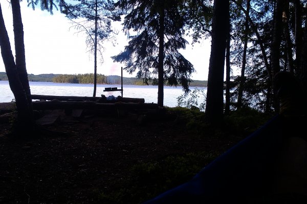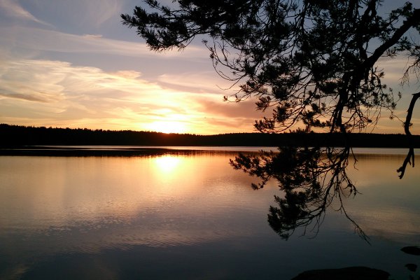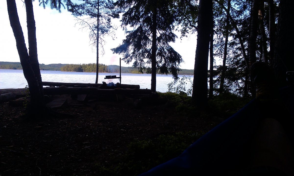 Ungefähr eine halbe Stunde nach unseren ersten Paddelschlägen (ich muss dazu sagen: ich war davor überhaupt erst ein einziges Mal Kanu fahren, und das war Jahre her, und zusammen hatten wir beide das sowieso noch nie gemacht) erreichten wir dann „unsere“ Insel, unser Zuhause für eine Woche. Trotz stellenweise gefühlt ordentlich Gegenwind und Wellen kamen wir trocken an. Wir hatten Glück, wir waren früh dran in der Saison, Mitte Juni, da war noch kaum etwas los. Außer „unserer“ Insel waren nur noch 3 weitere besetzt, und so haben wir, obwohl nur zu zweit, eine der größeren zugeteilt bekommen. Die haben wir auch gleich mal ein wenig erkundet, zumindest rund um unsere Anlegestelle, und dann dort auch unser Lager aufgeschlagen. Bevor wir uns aber richtig eingerichtet haben, stiegen wir nochmal ins Kanu und sahen uns die Gegend rund um unsere Insel noch genauer an. Kein Mensch dort, sehr ungewohnt, wenn man sonst eher in größeren Städten unterwegs ist! Später sortierten wir noch unser Gepäck, inspizierten Verpflegung und Kochbuch (gut, wir werden sicher nicht verhungern, reichlich von allem da! Aber ein Essensplan für die Woche schadete dennoch nicht), und, ganz wichtig, meine Hängematte fand zwischen 2 Bäumen auch einen guten Platz. Hängematte, Insel, Wasser – viel mehr braucht´s doch gar nicht. Unser erstes Abendessen waren Bratkartoffeln, gekocht und gebraten auf dem Lagerfeuer, und sehr lecker. Ein heißer Tee war dann auch super, denn gegen Abend wurde es doch noch ziemlich kühl. Zum Sonnenuntergang-Gucken fanden wir auch einen tollen Aussichtspunkt auf der anderen Seite der Insel. Die Idylle wurde nur ein wenig getrübt durch jemanden, der mit seinem wirklich lautem Motorboot extrem langsam irgendwo auf der anderen Seeseite längstuckerte. Abgesehen davon war es so ungewohnt ruhig – kein Wind mehr, keine Wellen, Stille. Auch nachdem die Sonne untergegangen war, wurde es aber nicht dunkel, sondern dämmerig. Midsommar stand auch kurz bevor. Irgendwann fallen wir dann aber doch ganz schön müde ins „Bett“.