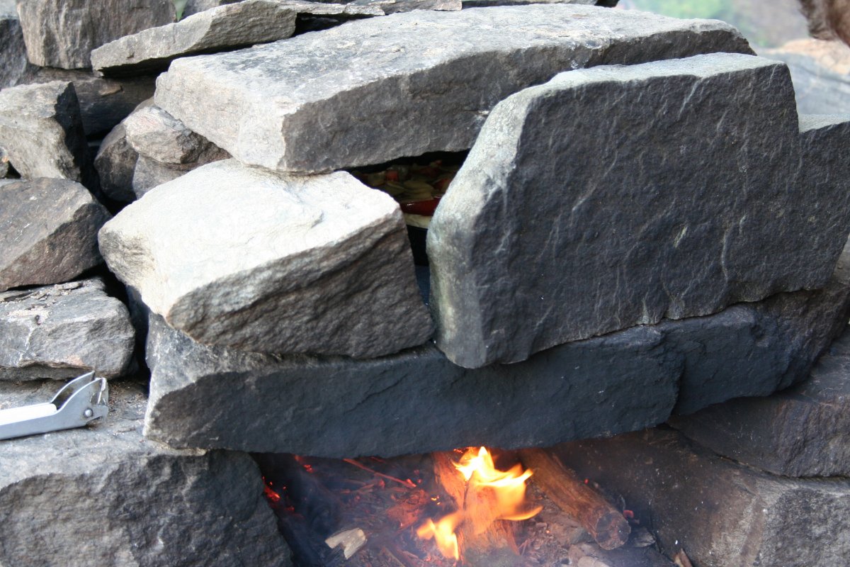Mitten in der Woche feierten wir dann auch noch Geburtstag, zur Feier des Tages gab es selbstgebackenen Apfelkuchen. Neben unserem Lagerfeuer hatten wir inzwischen auch einen richtigen Steinofen, darin ließ es sich gut backen. Die Pizza am nächsten Tag wurde auch richtig lecker. Nur zu empfehlen! Ansonsten kochten wir hauptsächlich die Gerichte aus dem Kochbuch nach, die Portionen sind wirklich reichlich bemessen, hungern mussten wir beide nicht. Und am Ende der Woche ist auch noch jede Menge übrig geblieben. Frische Milch, Eier und Kräuter zum Würzen haben wir zwar beide zeitweise etwas vermisst, für Blaubeeren und Pilze war auch noch nicht Saison, aber so richtig fehlten uns diese Dinge trotzdem nicht. Die Angelversuche meines Mannes blieben ebenfalls erfolglos, aber es waren auch seine ersten überhaupt, und da wir beide noch nie einen Fisch getötet und ausgenommen haben, war es vielleicht auch ganz gut so. Je weiter die Woche fortschritt, desto mehr freuten wir uns allerdings dann doch wieder auf ein richtiges Bett, eine heiße und ausgiebige Dusche und frischgewaschene Kleidung.