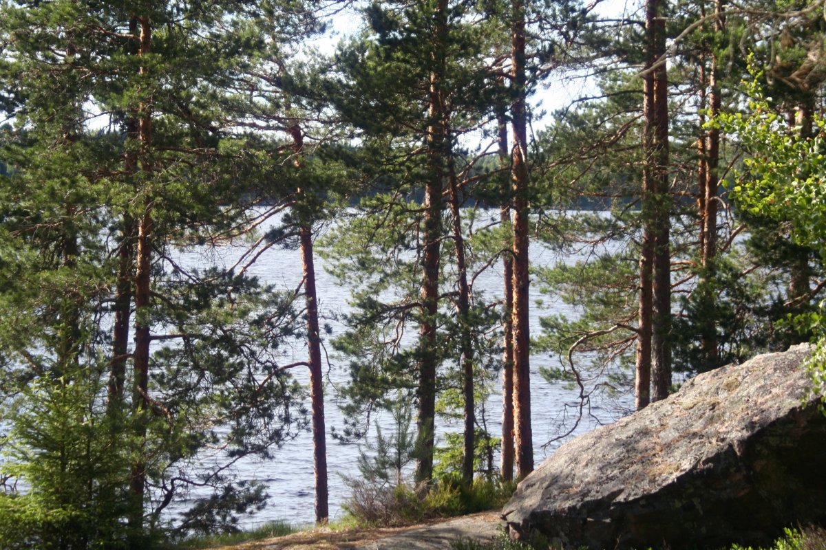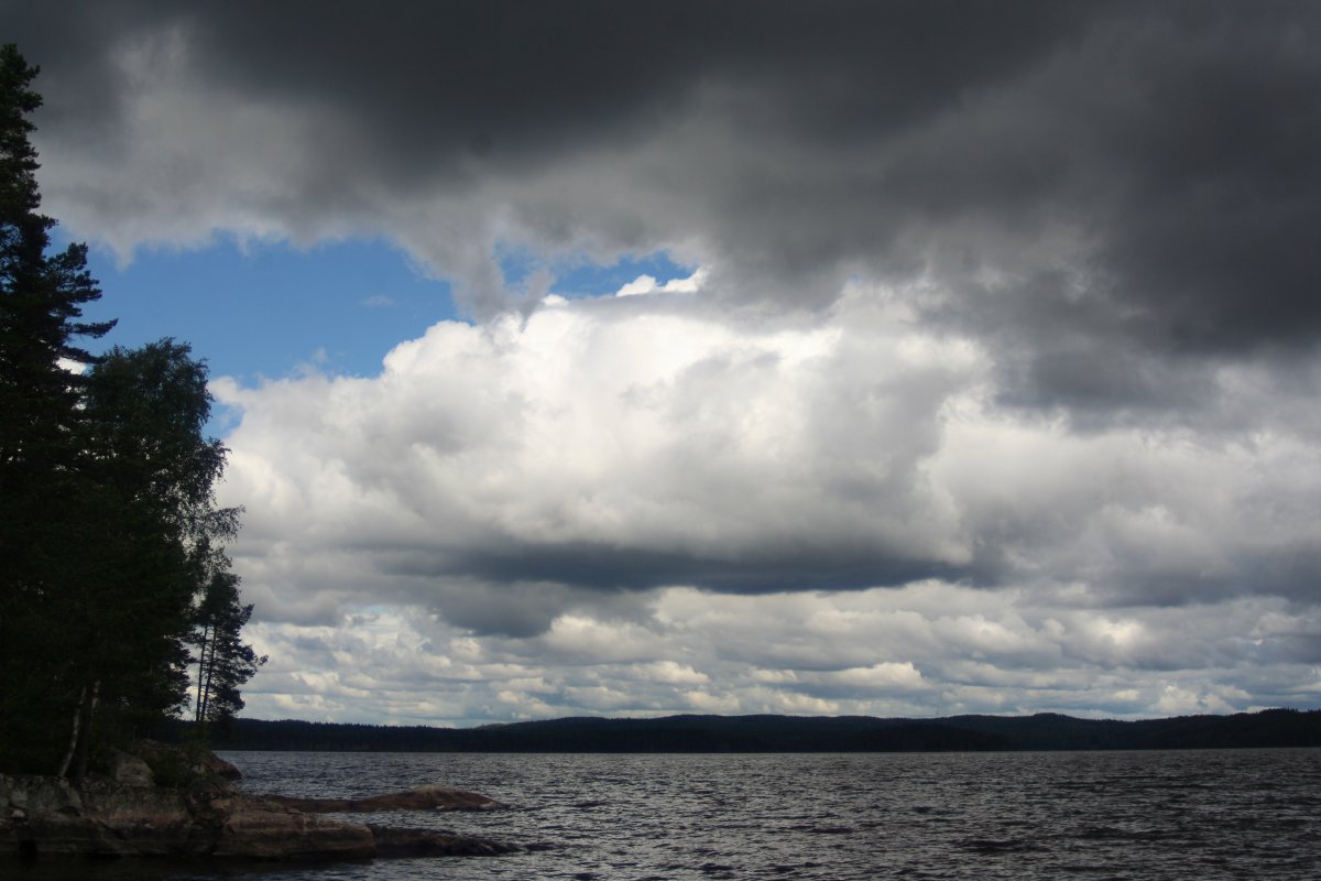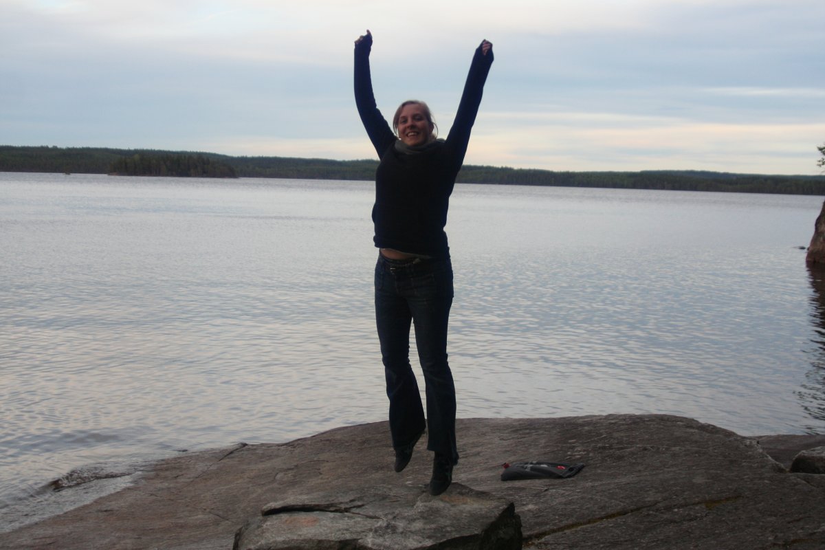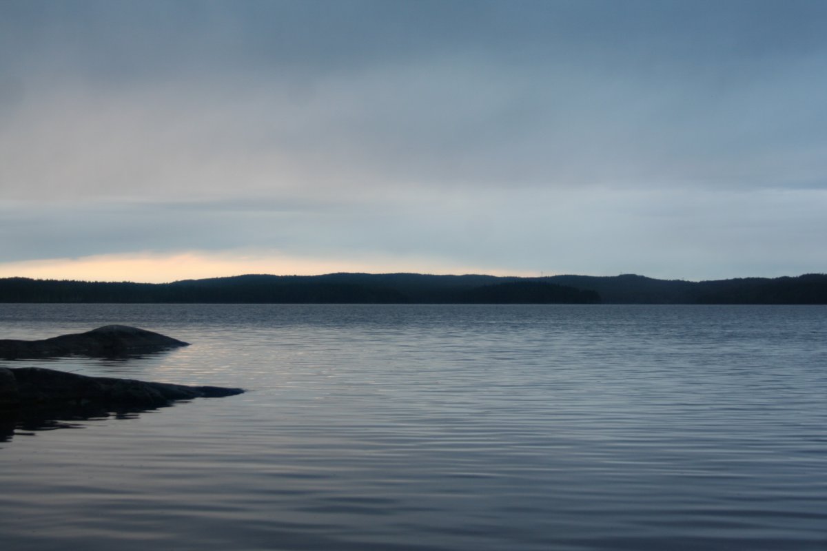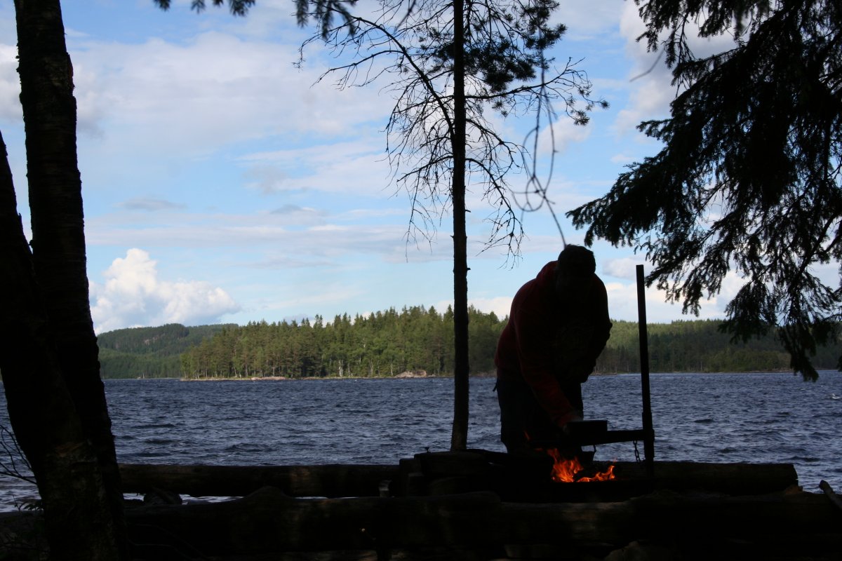 Die nächsten Tage wurde es allerdings windiger, was man beim Paddeln auch deutlich merken konnte. Zeitweise waren die Wellen höher als eine Woche später auf der Ostsee, als wir von Oslo nach Kiel fuhren (mit der Fähre, nicht per Kanu, versteht sich). Auf dem offenen See brachen sie schon, nicht erst an den Felsen. Eine Nacht hatte es auch nur noch 5°C – echt kalt, brrr! Ab sofort kochten wir unser Trinkwasser dann abends ab, damit ich eine Flasche noch heißes Wasser als Wärmflasche mit in den Schlafsack nehmen konnte und nicht ganz so sehr fror. Überhaupt war es ganz spannend zu beobachten, dass selbst so eine vergleichsweise kleine und schmale Insel 2 „Klimazonen“ hatte – die Seite zum See hin war je nach Windstärke relativ laut, durch die Wellen, die ans Ufer schlugen, und den Wind, dadurch auch zugig und kühl. Während man es hier vor allem abends und morgens nur mit dickem Pulli (und am besten am Feuer und mit heißem Tee) gut aushalten konnte, konnte man es sich auf der anderen Seite, die nicht vom Land nur durch einen recht schmalen Streifen Wasser getrennt war, zur selben Zeit im Bikini in der Sonne gemütlich machen und die Ruhe genießen.