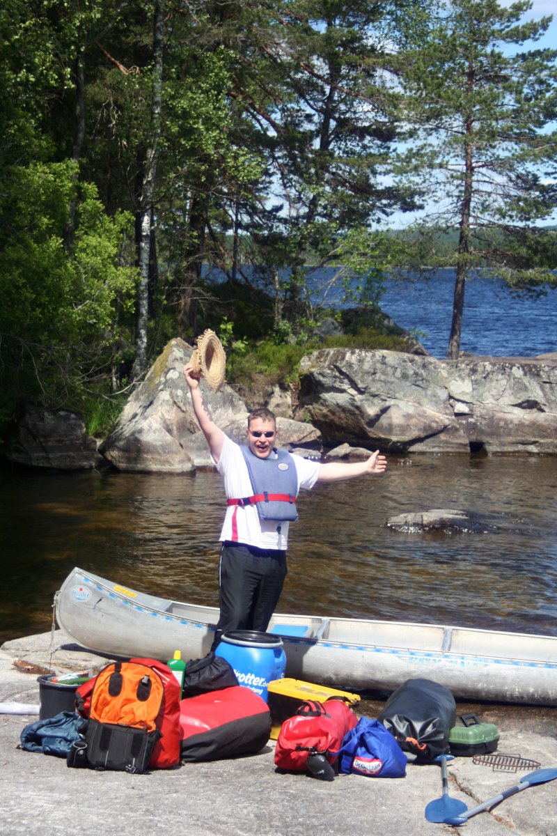Dort angekommen, wurden wir bei schönem Wetter nett in Empfang genommen, und konnten dann erst mal unseren Kram dem Auto aus- und in die Packsäcke umpacken. Dazu gab es dann noch die Verpflegungstonne, das Zelt und einiges anders Zubehör. Es war schon erstaunlich, dass wir das alles ins Kanu bekommen haben. Als es noch daneben lag, sah es jedenfalls nach sehr viel Gepäck aus. Aber sogar wir zwei passten nach einer kurzen Einweisung ins Kanufahren noch mit rein.